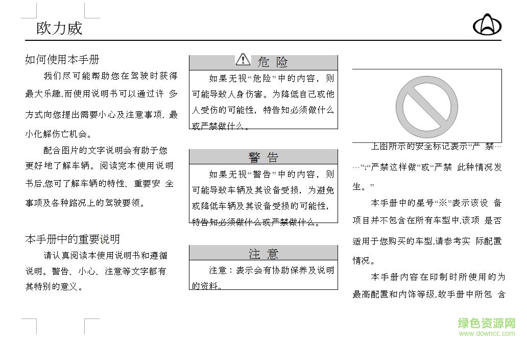 欧力威说明书电子版是一本讲解了用户在使用汽车时的各类事项,按键说明,导航系统的使用以及汽车保养知识的用户手册,轻松的为你带来汽车各项问题快速解决效果,快来绿色资源网下载吧!