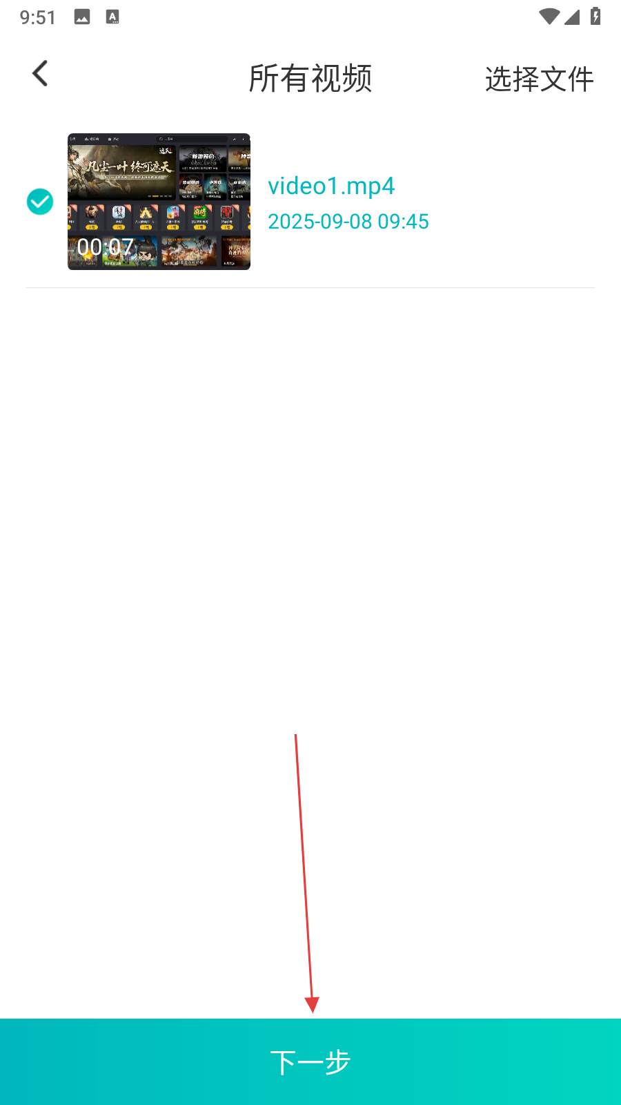 2、在所有视频列表中勾选需要压缩的视频文件,点击界面底部的下一步按钮。
