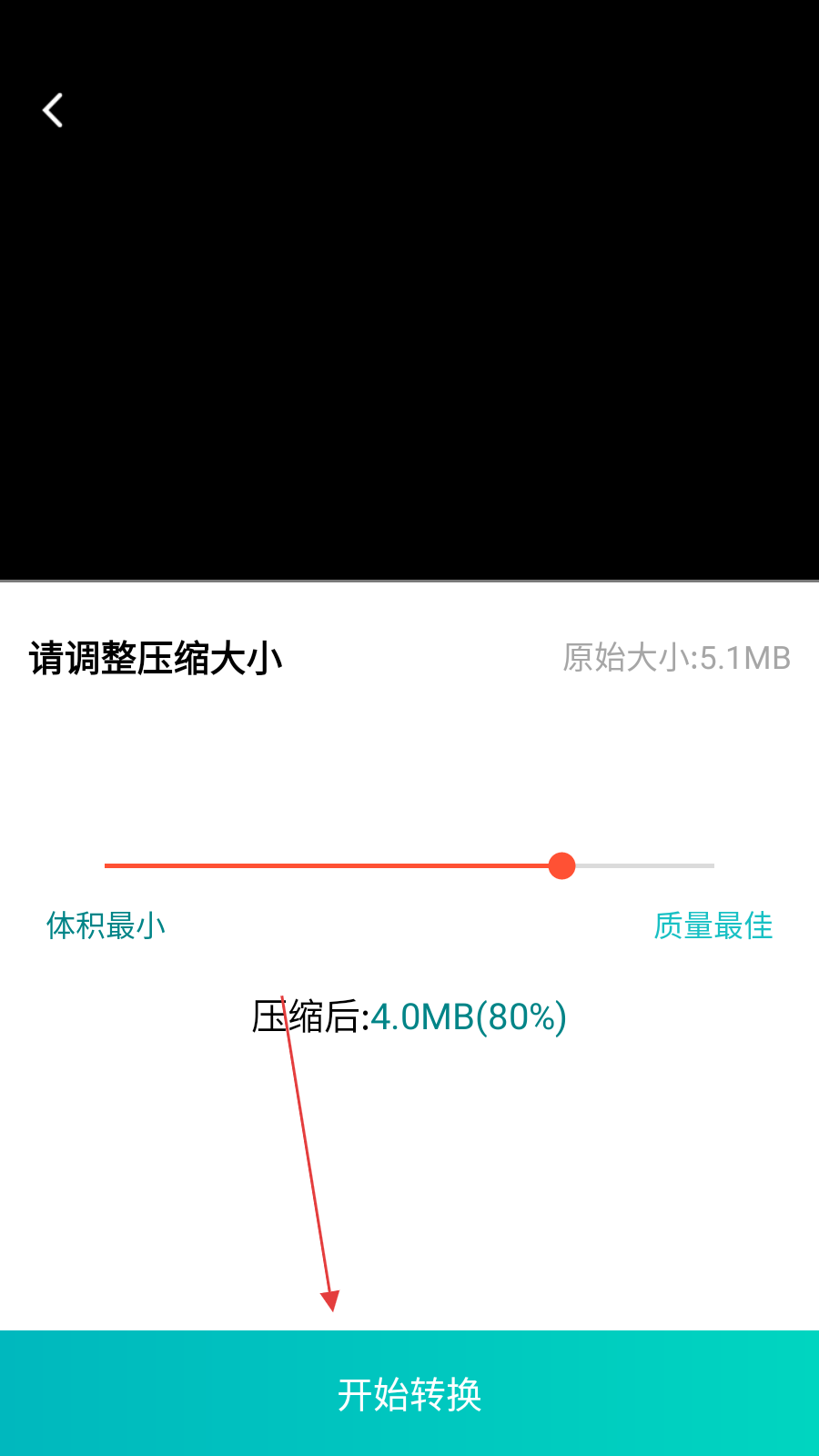 3、在压缩参数设置页面,拖动请调整压缩大小的滑块,调整视频压缩后的体积与质量平衡,设置完成后点击开始转换按钮。