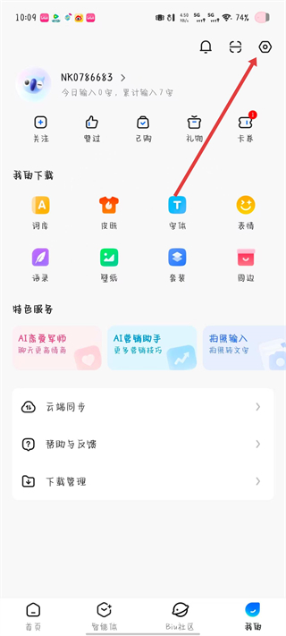 1、打开讯飞输入法,点击右上角的设置图标,进入设置界面。