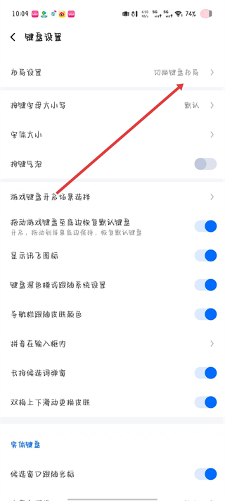 3、在键盘设置界面,点击布局设置右侧的切换键盘布局选项。