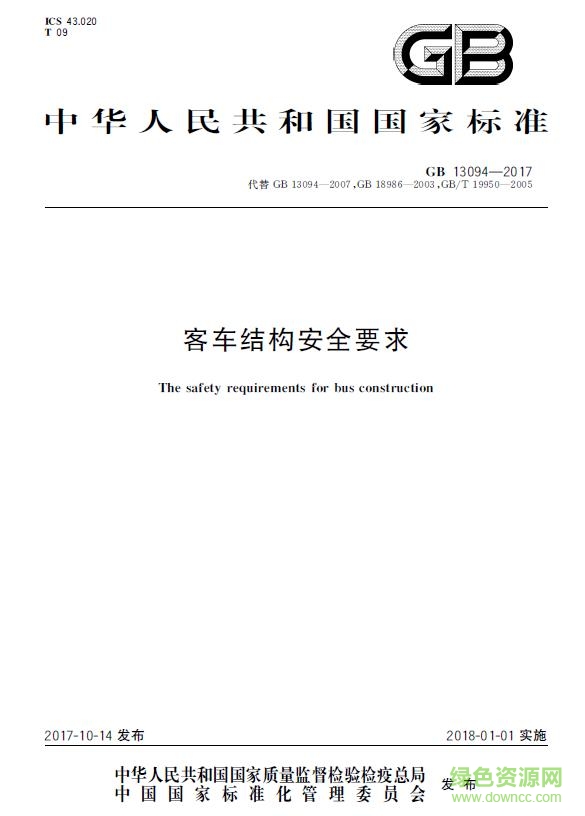 2018年1月1日,我国计划实行新的GB-13094《客车结构安全要求》。本标准代替GB13094-2007《客车结构安全要求》、GB18986-2003《轻型客车结构安全要求》和GB/T 19950-2005《双层客车结构安全要求》。本标准以GB13094-2007为主进行修订,整合了GB 18986-2003和GB/T 19950-2005的内容。