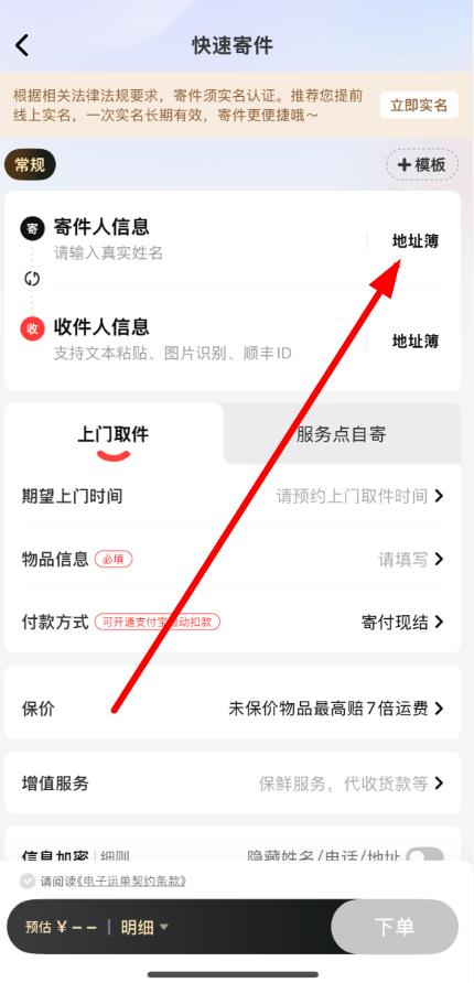 2、在快速寄件页面,点击寄件人信息或收件人信息右侧的地址簿。