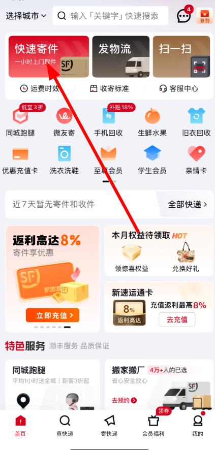 1、打开顺丰速运应用,在首页点击快速寄件进入寄件页面。