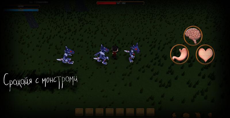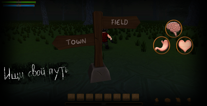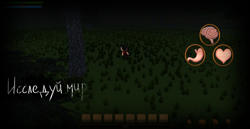游戏的故事讲述的是你因为一场意外的事故,流落到了一个荒原之上,在这里只有你一个人类,你没有任何依靠,而且你没有食物来源,很饿了,没有办法你必须拿起自己的武器或是想尽一切可以利用的东西,在这片恐怖无人的荒原上猎食。游戏界面非常简单,在游戏中玩家可以看到在右上角有三个图标,分别代表肠子,胃以及心脏,这三个东西代表的是你现在的状态,如果某一个提醒你了,那么你就需要猎捕食物活命,你可以收集资源,打怪,创建工具来让你在这世界生存下去。喜欢求生游戏的玩家可以下载感受下。