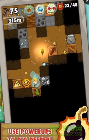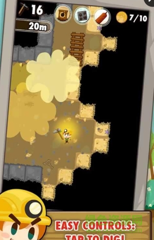 游戏玩法就是不停的向下挖,每次向下都需要挥动锄头,会碰到各种类型的泥土石块,有些只需要一次便可消除,有些需要敲击多次,还有的则需要升级锄头后才能击碎。