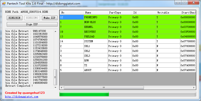 泛泰binx一键解压工具是一款来自越南的工具Pantech_Tool_Kits,这个工具的可以自动地把binx解压并制作成卡刷包,非常很不错的工具,生成的zip刷机包刷的是直接覆盖分区,虽然实际的步骤比较多binx->bin->img->zip,但这个工具可以自动地完成这些步骤,所以十分方便。