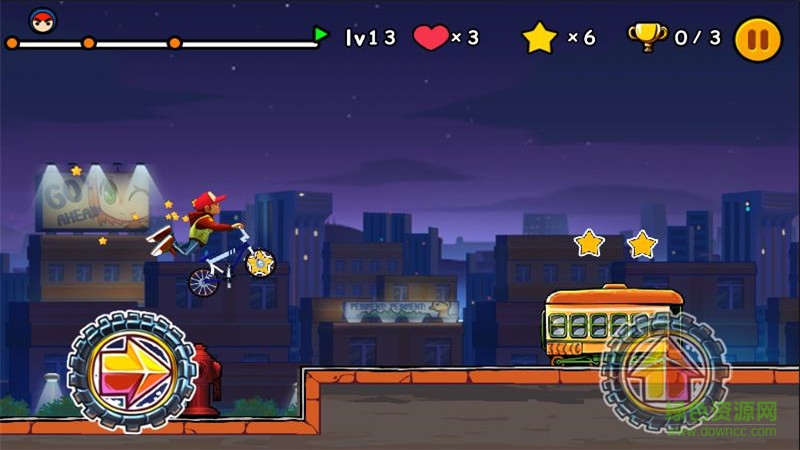 完美的控制、疯狂自行车特技、逼真的艺术、酷酷的配乐,游戏拥有3个场景和45级的挑战体验,内容精彩丰富。游戏中根据指示骑着BMX自行车完成一系列特技动作,需要在游戏中控制平衡,完成不同特技挑战。游戏画面精美,小轮车手特技高超过人,灵活的旋转、跳跃都会吸引您的眼球;12个精心设计的难度,您会遇到意想不到的困难及障碍。
