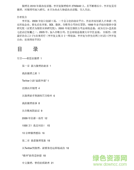 微博改变一切pdf电子版是由李开复编着的一款关于微博的读本,讲述了各种关于微博的信息,如如何编写内容、如何快速提升粉丝、最佳发微博频率等,是喜欢玩微博的用户比读本,欢迎来绿色资源网下载!