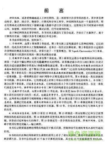 《神经网络原理》是一本系统地介绍神经网 络的基本概念、系统理论和实际应用的著作,本书注重对数学分析方法和性能优化的讨论,强调神经网络在模式识别、信号处理和控制 系统等实际工程问题中的应用。书中包含大量例题和习题,并配有13个基于matlab软件的计算 机实验程序。本书适于作研究生或大学高年级学生的教材,也可作希望深入学习神经网络的科技人员的 参考书。