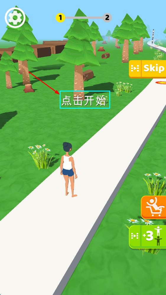 1、进入游戏界面,点击“点击开始”按钮,操控角色在道路上前进,途中会遇到可叠加的人物,靠近即可将其加入队伍,不断壮大叠人梯队。