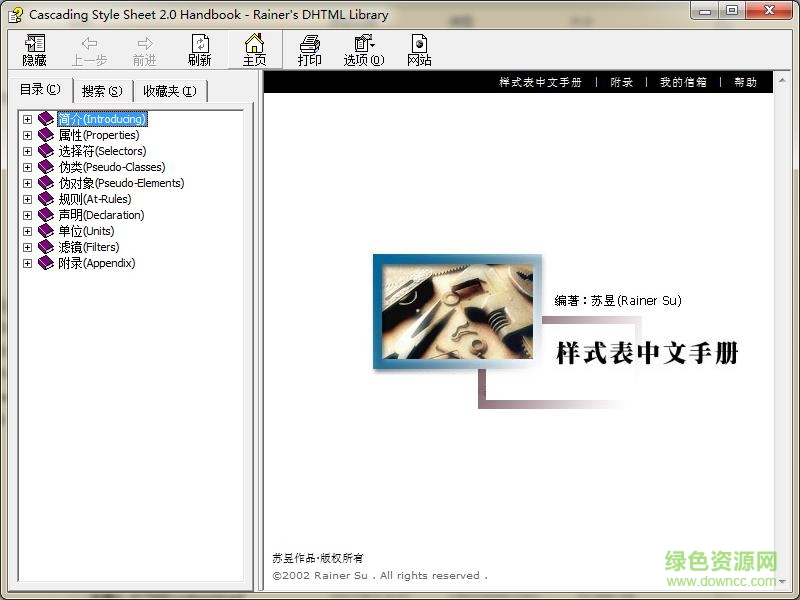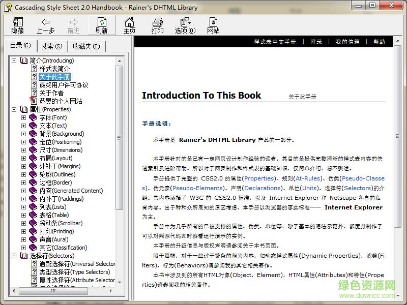css2.0中文手册电子版这本手册针对css开发用户们,能够为你带来十分全面的各类知识点查阅体验,拥有简单的使用界面,全面的各项知识,能够通过目录列表进行知识查阅,十分的便捷,能够为用户在网页设计过程中带来不错的帮助,快来绿色资源网下载吧!