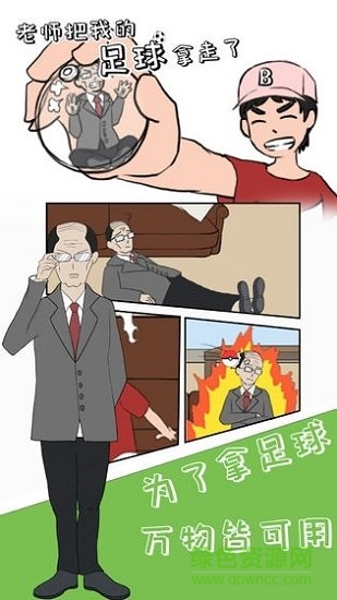 游戏以诙谐搞笑的画风,丰富的关卡设计,为玩家们展现了一场天马行空的想象,以各种道具和方式想办法从老师那里拿回你的足球,休闲的玩法,趣味的解谜方式。