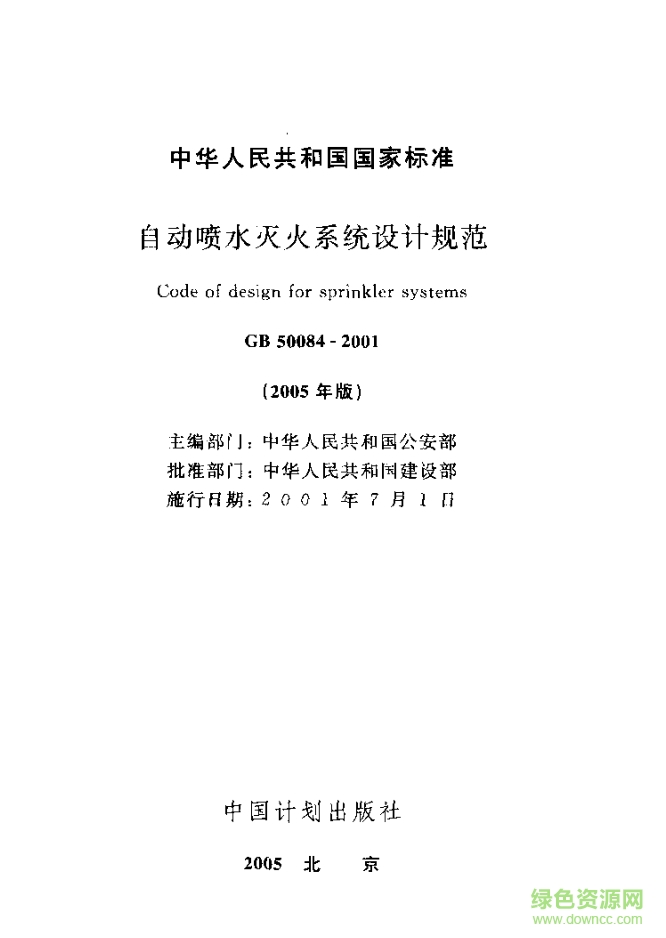 自动喷水灭火系统设计规范GB50084-2001(2005年版)规范共分11章和4个附录,对原版本5设计基本参数,6系统组件,7喷头布置,8管道和10供水等章节某些条款进行了修订,并新增加了12局部应用系统的内容和相关条款。自2005年10月1日起实施。这份规范适用于新建、扩建、改建的民用与工业建筑中自动喷水灭火系统的设计。