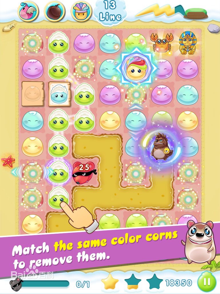 任意一个玉米只要颜色相同位置相邻,都可以连接,但同色并相邻的玉米必须至少三才能链接成一条线爆破掉,玩家要在每个关卡规定的画线条数下完成相应任务目标。