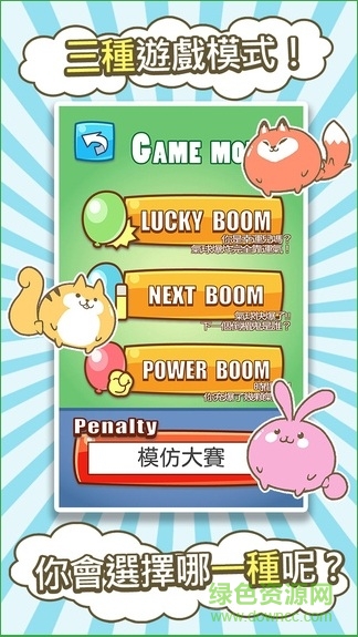 1、LUCKY BOOM:玩家轮流为气球充气,若气球爆炸或气球为最小的话就会受到惩罚。充气量的多寡为随机,所以一切都凭玩家的运气!