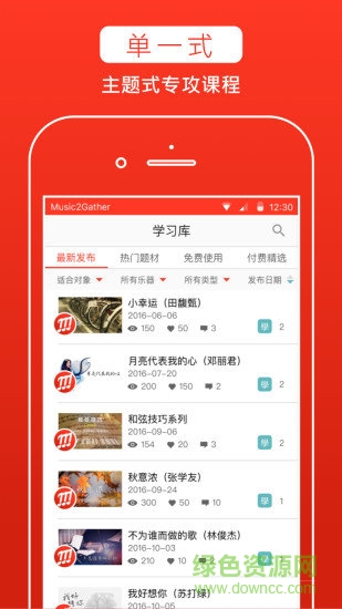 music2gather音乐而聚app是一款非常好用的手机学习音乐app,这里有丰富的课程资源,用户可以在手机上学习自己感兴趣的课程,还有众多乐谱可以查看,欢迎大家到本站下载使用!
