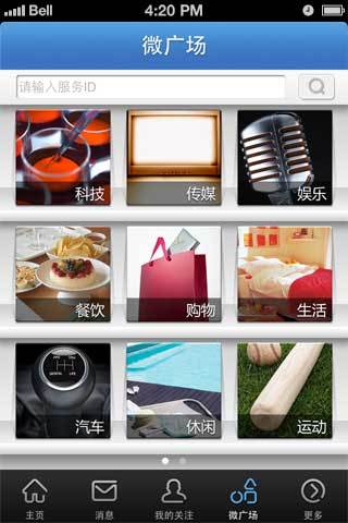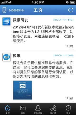 微讯主页:显示您所关注的商家、企业、机构等所发出的微讯信息