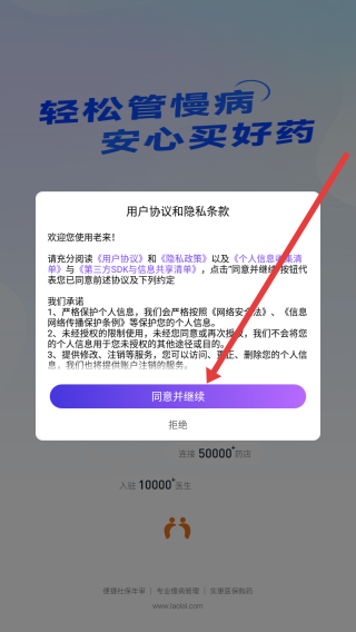 1、点开软件,阅读完协议和条款后点击同意并继续按钮,开始使用老来网。