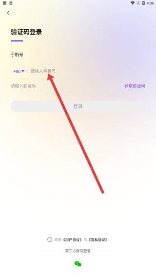 3、在登录页面内,点击输入框输入手机号以便获取验证码登录。