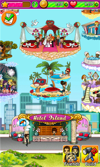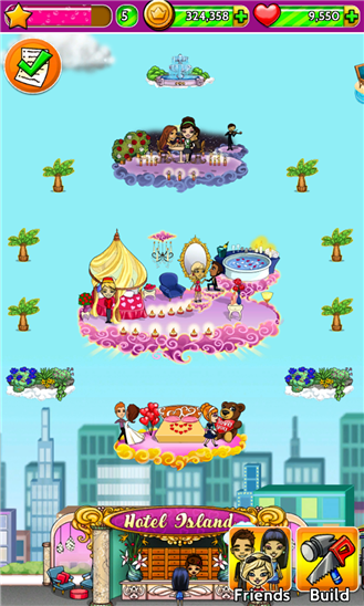 酒店岛天堂的故事(hotel island dream paradise)是一款免费模拟经营类游戏,天堂岛是一个充满了阳光和海水的地方,你所有的游客终极的向往之地,也是你的机遇之地。在这里,你需要发展自己的商业帝国,来满足游客们最基本的需求,并 逐步提高你的层次,为游客们创造出更舒适的旅游环境。你可以创建各种娱乐中心,也可以开设餐厅和迪斯科舞厅来吸引他们消费。在游戏中,你的任务是建设、经营管理你的温泉旅馆,包括提供住宿、餐饮、商场和泡温泉等各项服务。你还能用你的收入来装饰你的旅馆。等到你的温泉旅馆名声在外后,还能吸引各类社会名流光临。喜欢的朋友一起下载来试试吧!