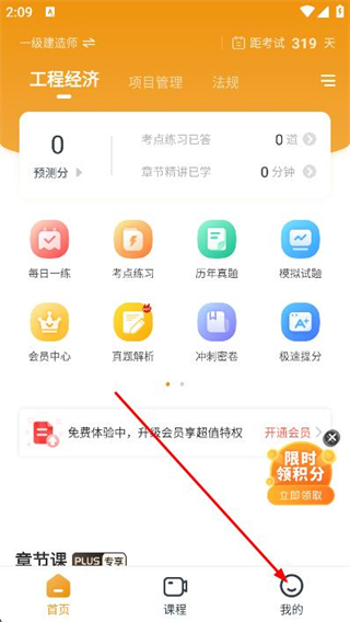 1、打开建筑工程准题库,点击底部导航栏我的。