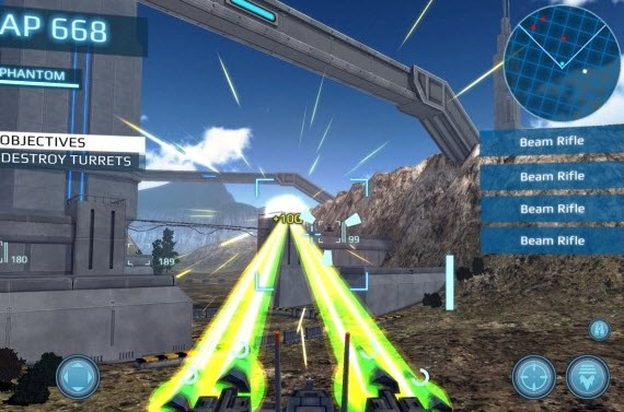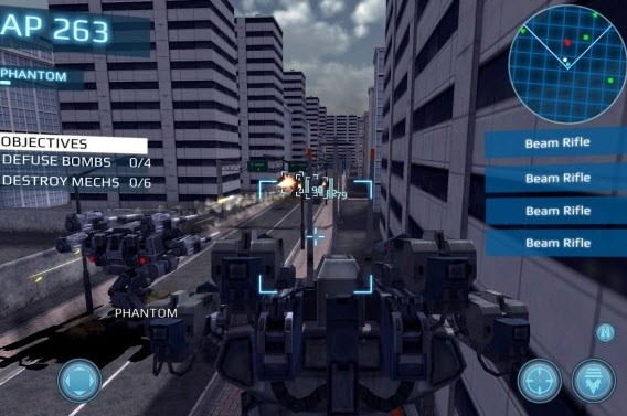 操作方面为虚拟按键,左下方向盘,右下攻击和飞行器,在攻击和飞行器的上面有放大视角的按键,不过按键略小,手指大的朋友要注意了。攻击和飞行器的按键上方是当前武器的横条,点击之后可以激活或者关闭该武器,这个设置是很贴心的。为什么?因为本作中的武器全部会因为连续的过度射击而发热,只要有一把武器过热,就会导致整个机甲的武器系统冷却,在这段时间内无法进行任何的攻击,所以大家可以选择把一些容易过热的重型武器在关键的时候在用。