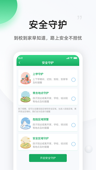 实时记录孩子当前位置和行动轨迹,可查看历史轨迹。进出常用地点、进入危险区域、离开安全区域,均会有预警,保障孩子的出行安全。