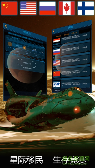 移民任务从世界上人口最少的国家,梵蒂冈开始,它只有842人。比较有挑战性的任务,包括美国(322760000人)、中国(1405372834人)、以及全世界的人口(7262306342人),等着你运送到火星。