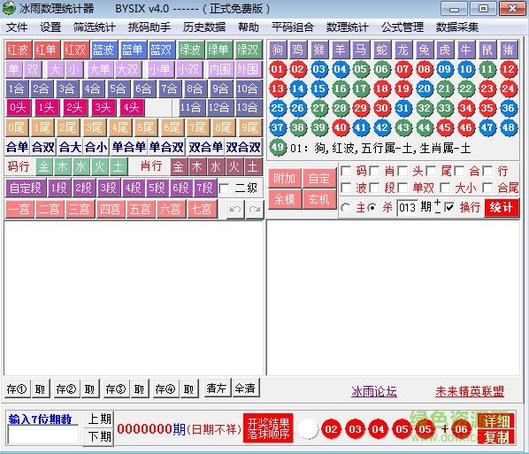 冰雨数理统计器正式版是一款免费的各种数据、号码统计工具,支持单双号、五行、生肖等预测和挑选,帮助用户更好的分析数字组合,来绿色资源网免费下载最新版吧!