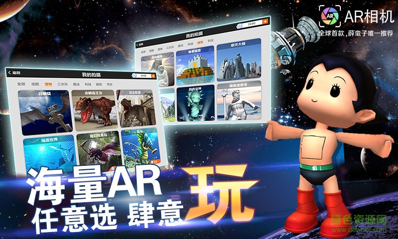 手心上调戏萌萌的卡通妹子?城市中惊现逼真的霸气恐龙?无论您是自拍娱乐的爱好者,还是猎奇黑科技的发烧友,《AR相机》都能满足你的需要。借助强大的自主研发的AR引擎和栩栩如生的3D技术,《AR相机》内置了数百种奇妙的AR虚拟物品,您可以将它们与周边现实景致相结合,拍摄出超乎想象的创意作品。可让您建立各种滑稽有趣的图片与影片。您可以在3D扩增实境空间中用涂鸦方式表达您的想法,也可以在观景窗中针对脸部投掷对象,如彩弹与水桶。建立令人难忘的图片与影片,与好友或可爱的小精灵玩恶作剧,看看它们的回应!