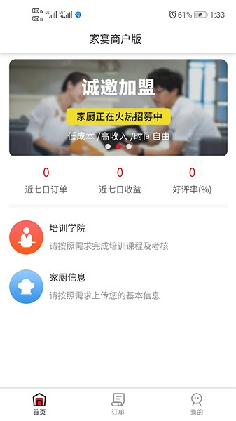 家宴家厨端,专为厨师们打造的便捷线上订单管理app,厨师可第一时间了解外卖订单需求,制作相应菜品,还可在社区分享做菜心得,学习其它大咖的下厨经验,制作更加美味的菜品,有需要的用户可以下载使用!