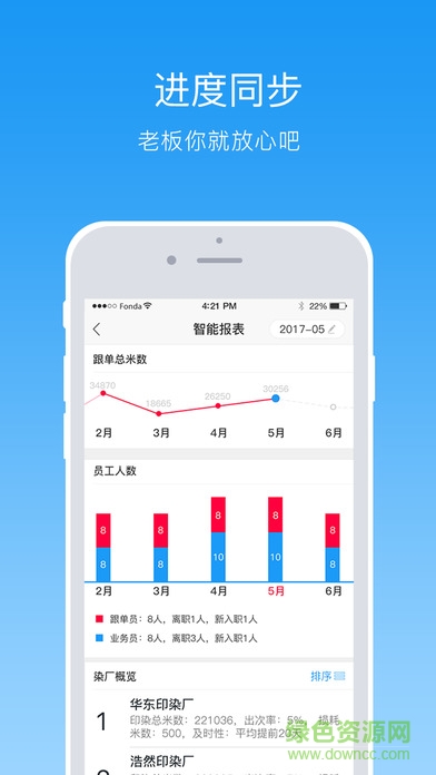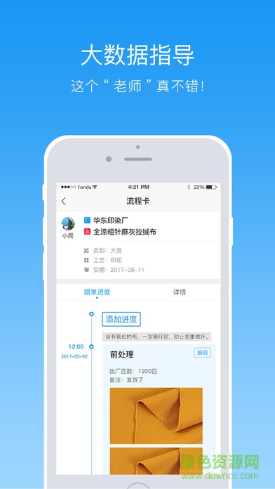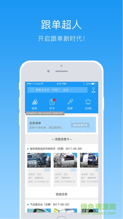 跟单超人,一个专业的印染行业跟单管理APP,通过跟单进度实时同步,使贸易公司更好的进行生产管理。