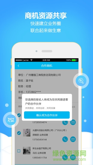 5.合作商机及资源共享:发布客户商机,收获N个1%分成;假如客户有10万元的成交,那提交就有1000元,将场地、人员、客户、设备、等信息共享出去,创收益