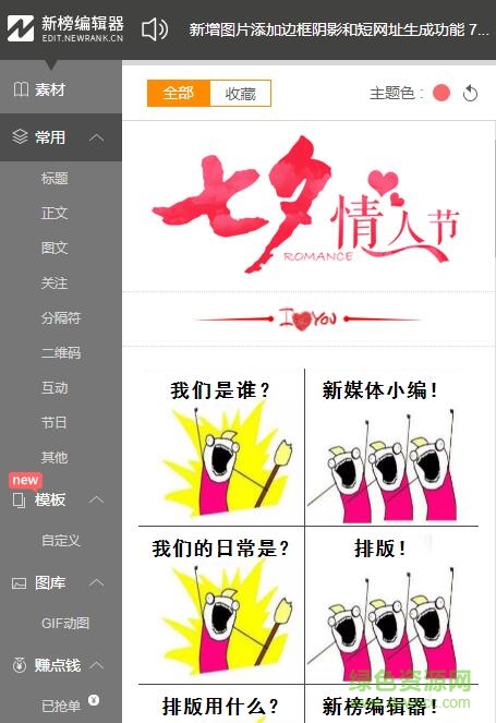 新榜编辑器是一款新型的编辑器的软件,能够帮助用户来对于自己的内容进行一个很合理的编辑以及排版,帮助用户来编辑出一个排版设计都十分的简洁、新颖的模板,能够很好的表达出自己想要表达的内容!七夕节快到了,快来绿色资源网下载新榜编辑器编辑高逼格的图文送给他/她吧!