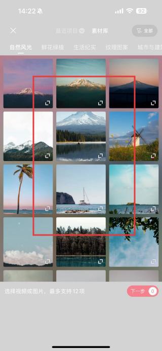 2、跳转至素材选择页,在自然风景等分类里,勾选要拼接的图片最多选12张,选好点下一步。