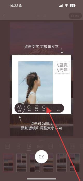 3、进入拼图编辑页,利用底部工具滤镜、裁剪等调整图片,点击文字区域可编辑文案,完成后点OK确认,生成拼图作品。
