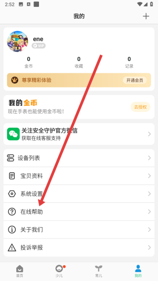 1、在我的页面中,可以点击在线帮助选项,进入查看问题的解决办法。