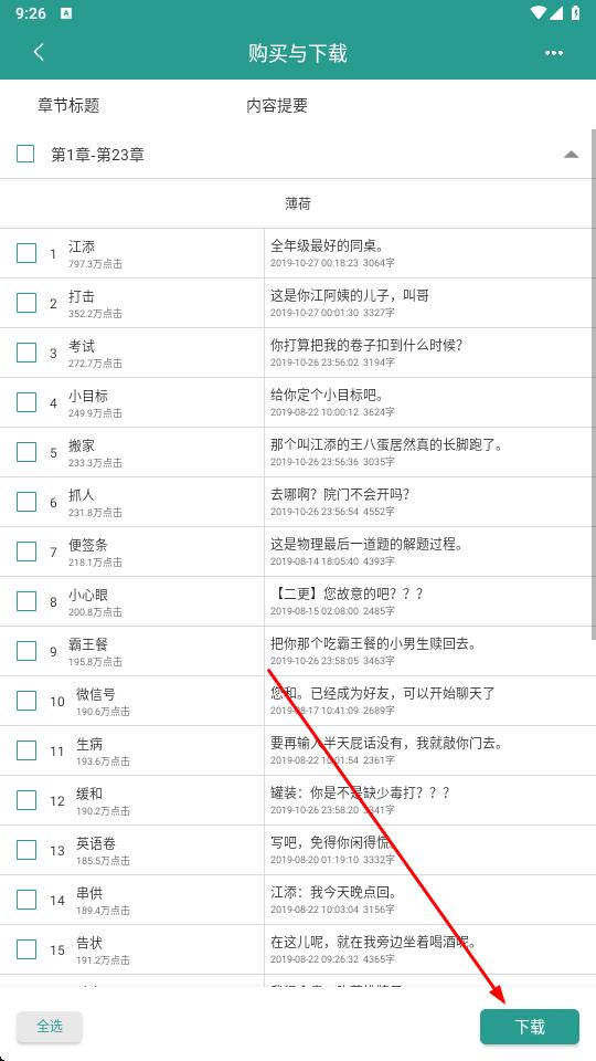 3、进入章节列表,勾选需下载的章节后,点击下载按钮,即可离线获取章节内容。
