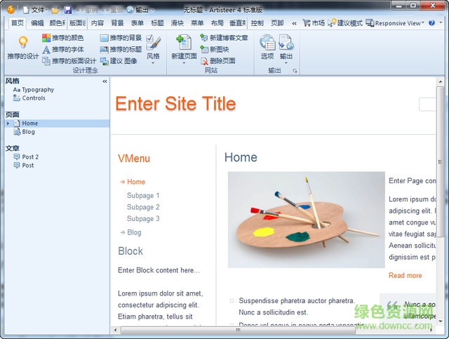 Artisteer4.3是一款完全可视化的网页设计编辑工具,通过它你可以创建出具有专业水准的网页。不需要有专业的网页编码知识和CSS知识也能够轻松使用它。你可以像使用WORD软件一样,添加文本和图像。软件内置了大量模板,包括各种类别模板,可以设置内容布局和界面风格,程序内置了推荐的设计、推荐的颜色和字体背景。软件界面简洁大方,非常方便使用者设计页面。