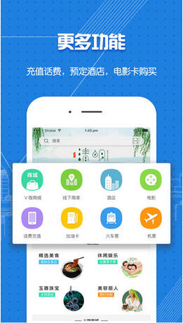 2、其中相关商品包括 话费充值,电影卡,酒店住宿,和商城多种商品,线下商家涵盖国内近千家各类商铺,为会员提供更好的消费体验。