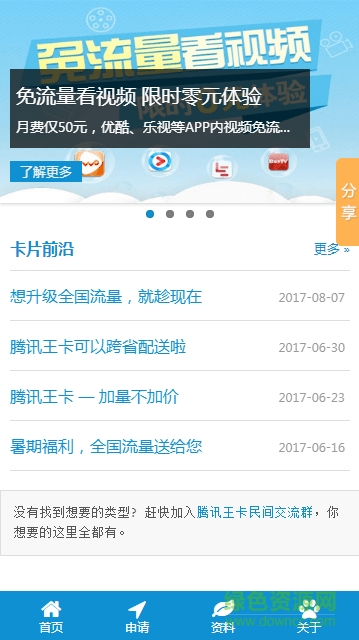 卡卡云助手app是一款免费生硬三大运营商网卡的平台,支持腾讯王卡、百度神卡、畅视卡、招商招卡等多中手机卡申请,让你看视频、聊天、刷微博、玩游戏再也不担心流量用超,绿色资源网诚意推荐!