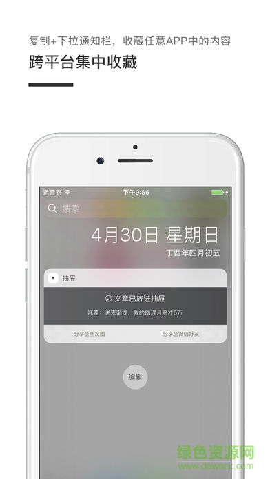 跨平台集中收藏:从任何APP中瞬间收集文章、文字、网址、视频。无需切换跳转,将散落在各处的干货整合到一起。