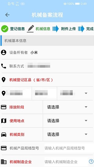 在线即可对车主机械备案登记,填写相关登记信息、机械信息,上传附件即可;