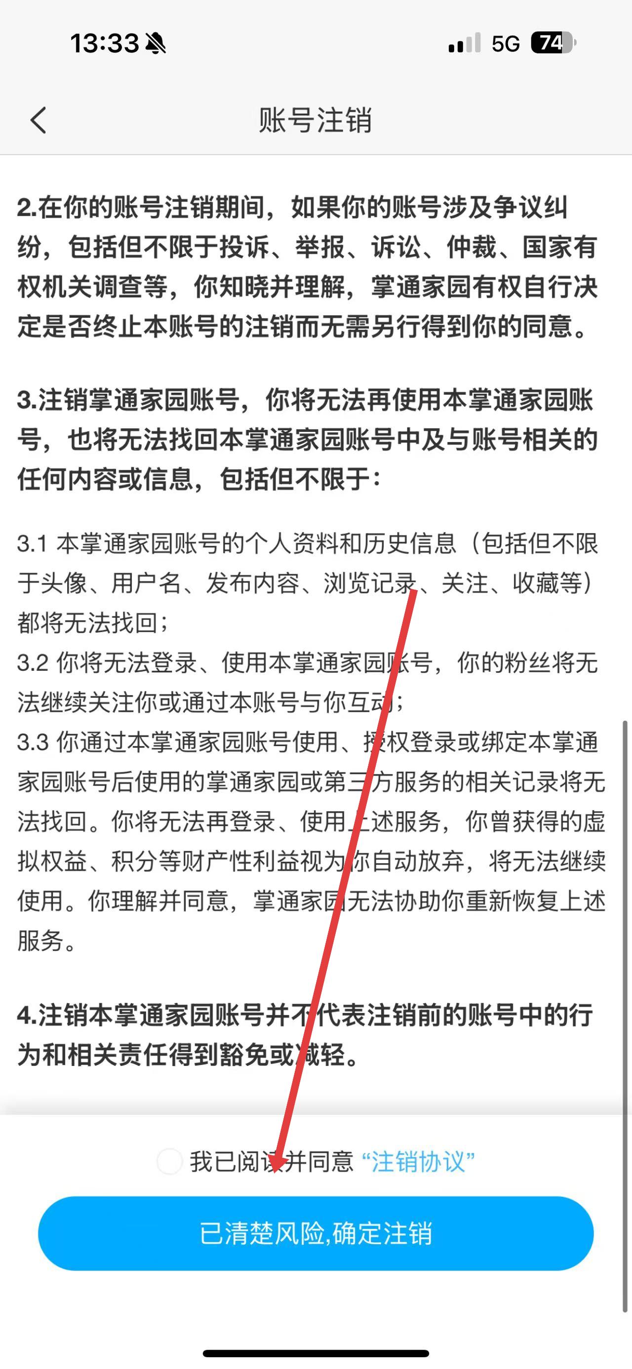 4、仔细阅读账号注销相关协议及提示,点击已清楚风险,确定注销按钮,按照后续提示完成账号注销操作。