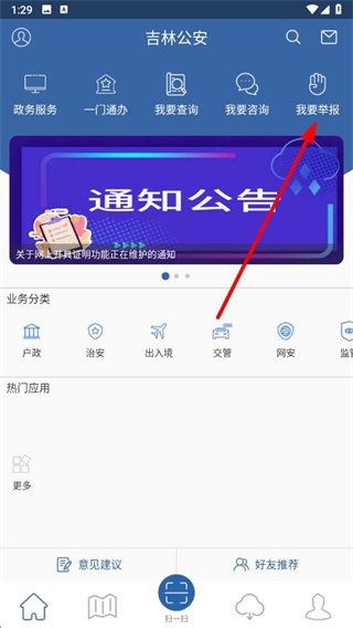 1、打开吉林公安app,点击首页的我要举报选项进入投诉举报页面。