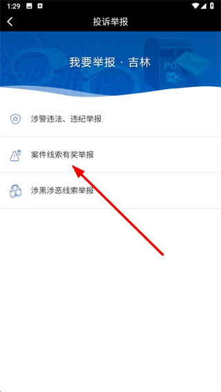 2、在投诉举报页面中,点击案件线索有奖举报选项。