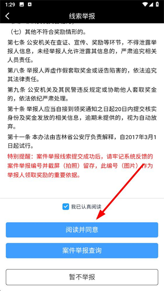 3、在线索举报页面,勾选我已认真阅读后点击阅读并同意。