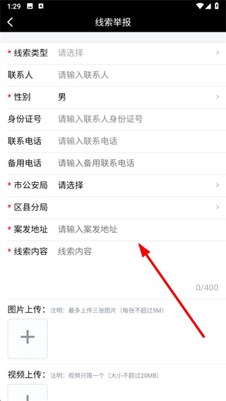 4、在线索举报表单中,依次填写线索类型、联系人、身份证号、联系电话等信息,上传相关图片或视频,完成后提交即可。