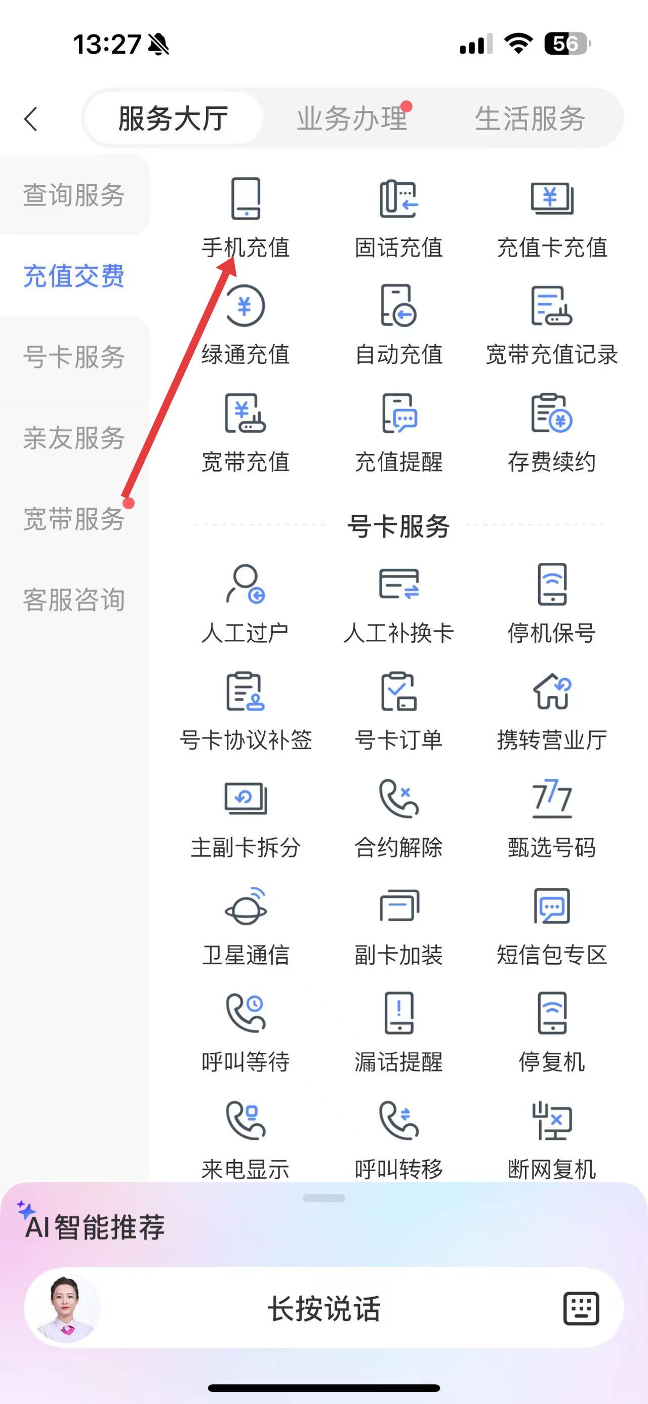 2、在服务大厅,找到充值交费板块,点击手机充值选项。